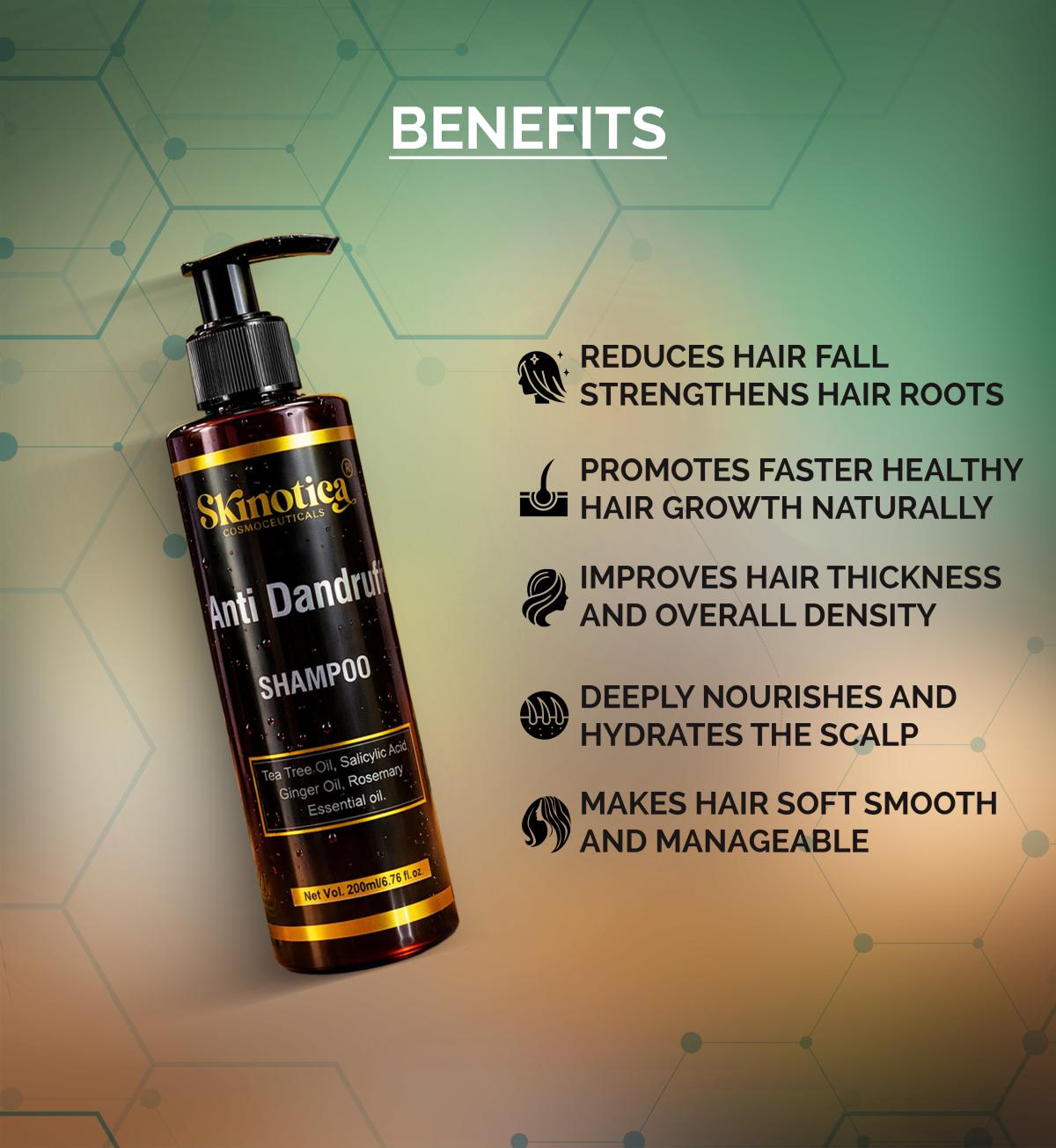 ANTI-DANDRUFF SHAMPOO BY SKINOTICA COSMCEUTICALS CONTAINS SALICYLIC ACID CAN ENTER INTO AND CLEANSE PORES, PREVENTING OIL BUILDUP AND HELPING TO UNCLOG YOUR HAIR FOLLICLES. THIS CAN MEAN HEALTHIER HAIR GROWTH AND FEWER SKIN ISSUES, SUCH AS SEBORRHEIC DERMATITIS OR DANDRUFF. GINGER ESSENTIAL OIL CONTRIBUTES TO THE HEALTH AND CLEANLINESS OF THE SCALP, SOOTHES DRYNESS AND ITCHINESS , AND ENHANCES HEALTHIER HAIR GROWTH BY STIMULATING AND IMPROVING CIRCULATION TO THE SCALP.