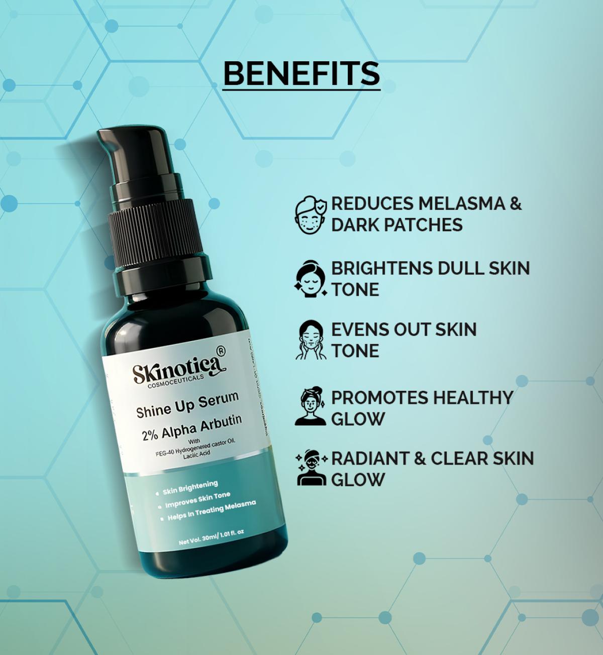 * REDUCES TANNING & SPOTS :- Reduces dark spots, acne marks resulting in even skintone. Alpha Arbutin added in this serum by skinotica cosmoceuticals is proiven to reduce tanning after UV exposure. A regular use of shine up serum can help in reducing skin tan, dark spots and photo damage along with broad spectrum sunscreen.