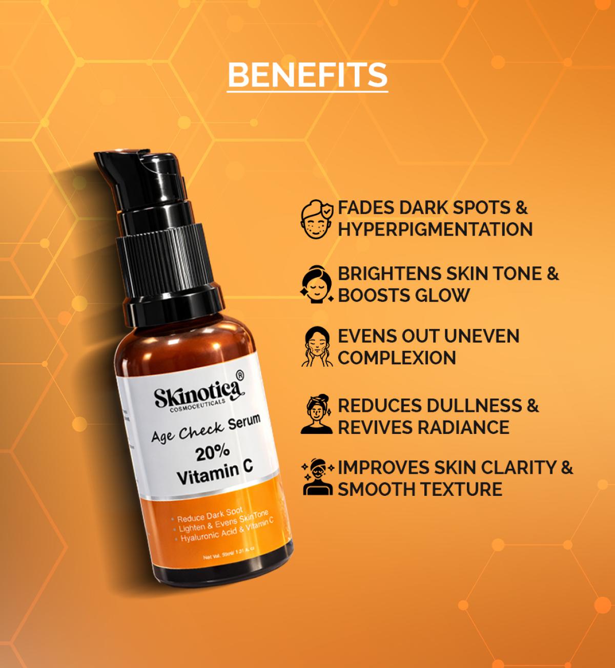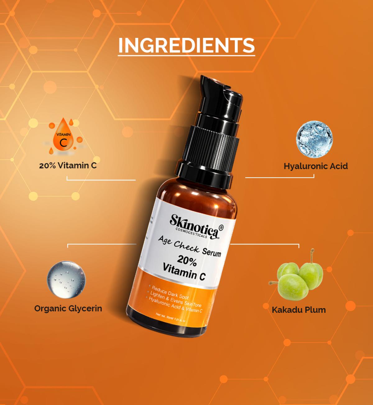 AGE CHECK SERUM BY SKINOTICA COSMOCEUTICALS 20% Vitamin C, FERULIC ACID AND HYALURONIC ACID Face Serum for Men and Women for Skin Radiance - 30 ml(SKINOTICA)